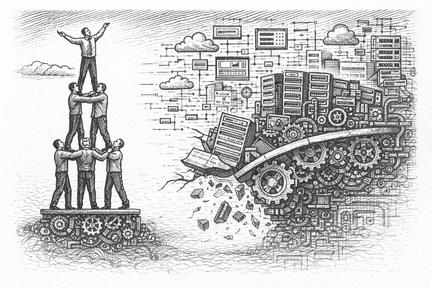 Esta lógica ignora la ley de Brooks: añadir personal a un proyecto retrasado solo lo retrasa más. En la era moderna, el riesgo no es solo el retraso, sino el costo estructural. Cada nueva incorporación incrementa exponencialmente el número de interacciones, dependencias y la carga de coordinación necesaria. El sistema se vuelve más frágil precisamente cuando se busca robustez.